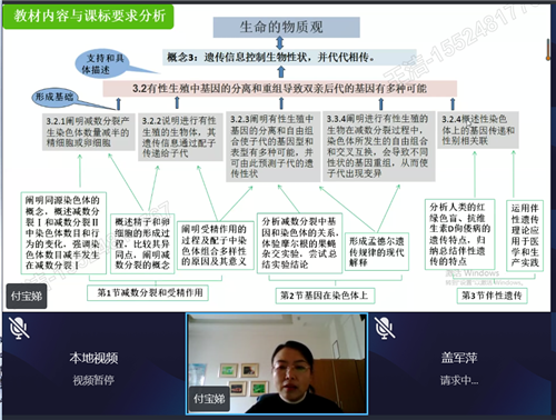 此次線上活動(dòng)主要安排了三大方面內(nèi)容:第一方面進(jìn)行試題分析,由大連市第8中學(xué)的萬(wàn)廣威老師代表命題組做了2021~2022學(xué)年度高一生物學(xué)上學(xué)期期末考試試題分析的講座;第二方面進(jìn)行教學(xué)引領(lǐng),分別由1中的張國(guó)華老師和13中的付寶娣老師做了基于核心素養(yǎng)的必修2第1章、第2章的單元教學(xué)設(shè)計(jì)及課例分享的講座;第三方面,由研訓(xùn)教師王潔老師進(jìn)行了上學(xué)期期末考試試卷分析并提出相關(guān)的教學(xué)建議,并對(duì)本學(xué)期生物室和高一生物學(xué)學(xué)科的研訓(xùn)工作做了部署。萬(wàn)廣威老師用了近一個(gè)小時(shí)時(shí)間從試題的命制思路、試題的考查點(diǎn)、試題命制過(guò)程、學(xué)生的答題情況及啟示五個(gè)方面進(jìn)行了有理有據(jù)的分析,其中對(duì)學(xué)生答題中出現(xiàn)的問(wèn)題分析到位,啟示非常有利于各校下一步的教學(xué)。張國(guó)華老師從大單元教學(xué)的角度以“通過(guò)分析孟德?tīng)柊l(fā)現(xiàn)遺傳規(guī)律的過(guò)程,體會(huì)假說(shuō)—演繹法的研究思路”為單元核心任務(wù),從單元學(xué)習(xí)目標(biāo)的確定、單元思路框架設(shè)計(jì)、單元活動(dòng)案例設(shè)計(jì)、單元學(xué)習(xí)評(píng)價(jià)設(shè)計(jì)四個(gè)方面對(duì)必修2第1章進(jìn)行了具體的設(shè)計(jì),為便于老師們理解單元教學(xué)與課時(shí)教學(xué)的關(guān)系,又以孟德?tīng)柕耐愣闺s交實(shí)驗(yàn)(一)第一課時(shí)為例進(jìn)行了具體課例如何實(shí)施的分析。付寶娣老師亦從大單元教學(xué)的角度以“在減數(shù)分裂、受精作用細(xì)胞學(xué)現(xiàn)象的基礎(chǔ)上,研究基因和染色體的關(guān)系” 為單元大任務(wù),從單元學(xué)習(xí)目標(biāo)的確定、單元教學(xué)流程的設(shè)計(jì)、學(xué)習(xí)活動(dòng)和教學(xué)過(guò)程的設(shè)計(jì)三個(gè)方面對(duì)必修2第2章整個(gè)單元及對(duì)應(yīng)的每個(gè)課時(shí)進(jìn)行了詳細(xì)的分析和課例分析。張國(guó)華和付寶娣兩位教師通過(guò)自身的學(xué)習(xí)和研究,對(duì)大單元教學(xué)的設(shè)計(jì)及如何實(shí)施做了很好的詮釋?zhuān)峁┑馁Y料對(duì)老師們理論能力的提升及隨后的第1、2章的教學(xué)起到了很好的引領(lǐng)作用。
