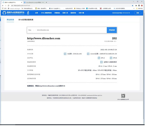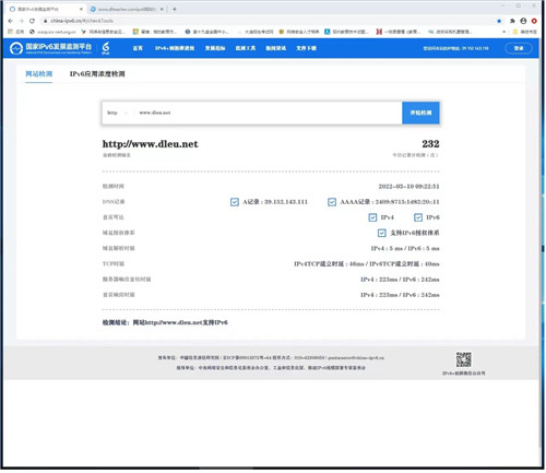 經(jīng)IPv6發(fā)展監(jiān)測(cè)平臺(tái)測(cè)試驗(yàn)證,對(duì)門戶網(wǎng)站的連通性、穩(wěn)定性,以及IPv6網(wǎng)絡(luò)有效性逐一驗(yàn)證,達(dá)到預(yù)期效果。我院已經(jīng)實(shí)現(xiàn)了IPv6域名可解析、可訪問,達(dá)到了IPV6的升級(jí)改造要求,學(xué)院IPV6部署工作宣告完成。