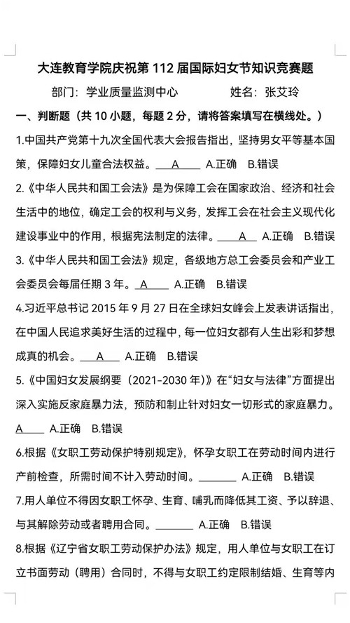 第112個“三八”國際婦女節(jié)來臨之際,學院工會組織開展了網(wǎng)上女教職工權(quán)益保護維權(quán)知識競賽活動。