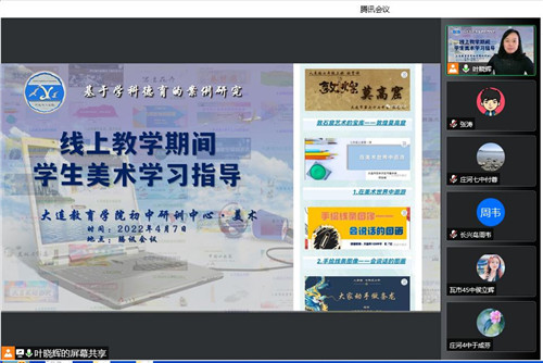 該活動(dòng)由大連市初中美術(shù)研訓(xùn)教師葉曉輝主持,主題為“基于學(xué)科德育的案例研究——線上教學(xué)期間學(xué)生美術(shù)學(xué)習(xí)指導(dǎo)”。首先葉曉輝老師簡(jiǎn)介了大連初中美術(shù)線上教學(xué)調(diào)研情況,提出了學(xué)生美術(shù)學(xué)習(xí)指導(dǎo)的重要性。然后從線上學(xué)習(xí)指導(dǎo)導(dǎo)什么和怎樣做兩方面進(jìn)行了講座,重點(diǎn)介紹了“大連初中美術(shù)”微信公眾號(hào)云課堂的服務(wù)應(yīng)用,并提出“熟、推、促、評(píng)”的落實(shí)策略,同時(shí)建議教師從國(guó)家、省、市智慧教育平臺(tái)獲取優(yōu)質(zhì)資源轉(zhuǎn)化服務(wù)指導(dǎo)學(xué)生。