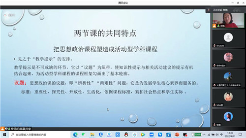 最后羅老師對(duì)兩節(jié)課進(jìn)行了總結(jié),指出了其共同特點(diǎn)都是將思想政治課塑造成活動(dòng)型學(xué)科課程,以“議題”為紐帶,使知識(shí)性提示與活動(dòng)建議的提示有機(jī)結(jié)合起來,圍繞議題展開活動(dòng)設(shè)計(jì),使活動(dòng)成為承載內(nèi)容目標(biāo)的基本方式;此外,對(duì)精品課評(píng)審過程和評(píng)價(jià)指標(biāo)進(jìn)行了說明,總結(jié)了前一階段線上教學(xué)的優(yōu)點(diǎn)和不足,并提出了教學(xué)改進(jìn)建議。此次活動(dòng)令老師們收獲頗豐,有效促進(jìn)老師反思課堂,不斷提升線上授課質(zhì)量。