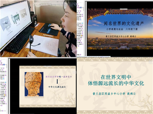 接著由大連市普蘭店區(qū)同益中心小學高鴻云老師做課例分享。高老師執(zhí)教的是統編版道德與法治教材六年級下冊第三單元第6課《聞名世界的文化遺產》。教師通過視頻、地圖、朝代表重點講解了殷墟和甲骨文讓學生體悟中華文化的源遠流長。課后高老師就本節(jié)課并圍繞普蘭店區(qū)研訓主題做了“在聞名世界的文化遺產中體悟中華文化的源遠流長”的教材解讀。
