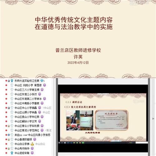 “最美人間四月天,不負春光與時行”。雖然大連的疫情現在仍處于嚴格防控期,但我們“停課不停學,停課不停研”。2022年4月12日,“大連市小學思政課系列主題教研活動之三”在yy語音平臺有序開展,本次活動主要展示了普蘭店區(qū)“中華優(yōu)秀傳統文化主題內容在道德與法治教學中實施”的階段成果,全市共有467名教師參與了活動。
