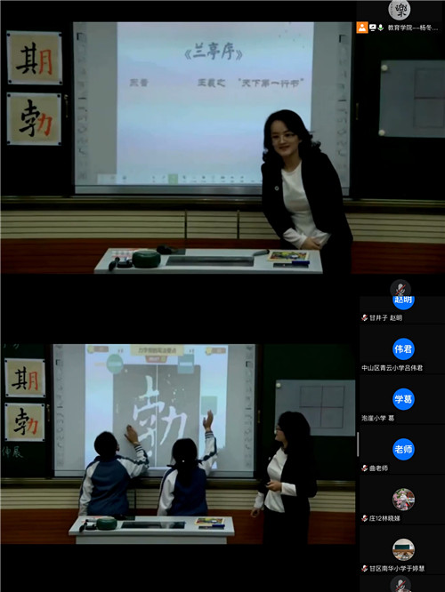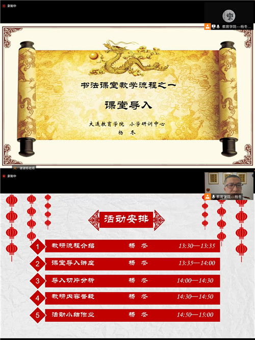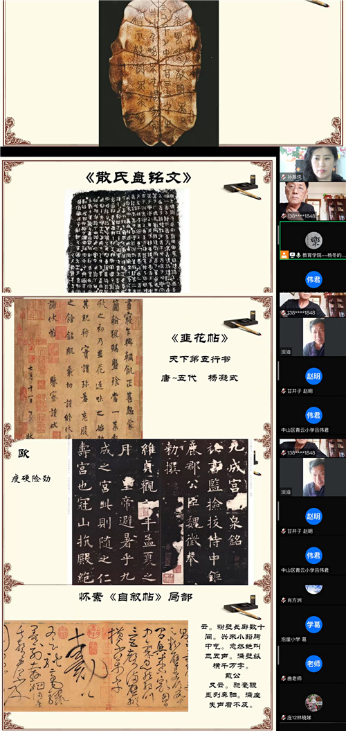 本次會議由小學(xué)研訓(xùn)中心楊冬老師主持,主要有五項(xiàng)內(nèi)容:楊老師介紹此次研訓(xùn)活動的開展背景;楊老師做“課堂導(dǎo)入的方法”的講座;參會老師共同觀摩幾種不同類型的書法課堂導(dǎo)入的視頻切片;楊老師就老師們對此次研訓(xùn)活動和近期“雙減”背景下的書法線上教學(xué)的方法和注意事項(xiàng)包括數(shù)字課堂的使用建議等提出的主要問題和困惑進(jìn)行了解答;楊冬老師布置作業(yè),并對此次活動進(jìn)行小結(jié)。