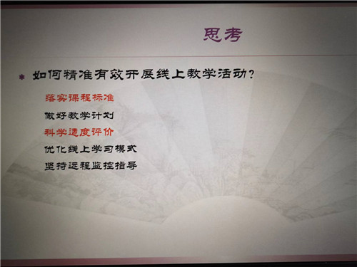 本次活動中,單江紅老師首先就“如何精準有效提高線上教學質量”這一問題組織各區(qū)域研訓教師進行了研討,大家分析了線上課堂教學設計與實施過程中存在的主要問題,并交流分享了各自成功的經(jīng)驗,提出了依標教學、適度實施評價等應對策略,為我市各區(qū)域英語研訓教師線上教學工作指導提供了新的方向和路徑。