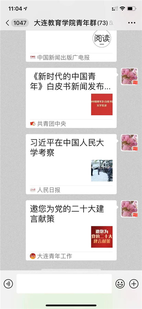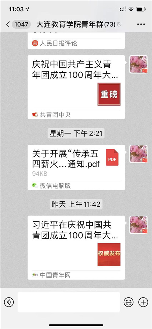 學(xué)院團(tuán)委在活動(dòng)期間通過大連教育學(xué)院青年群組織學(xué)院青年教職工學(xué)習(xí)習(xí)近平總書記關(guān)于紀(jì)念五四運(yùn)動(dòng)100周年、青年工作、教師方面的講話精神;學(xué)習(xí)習(xí)近平總書記關(guān)于疫情防控工作的系列重要講話和指示批示精神;學(xué)習(xí)《新時(shí)代的中國青年》白皮書、總體國家安全觀主要內(nèi)容;學(xué)習(xí)今年五四青年節(jié)前夕,習(xí)近平在中國人民大學(xué)考察的講話精神、習(xí)近平給北京科技大學(xué)的老教授的回信和習(xí)近平給中國航天科技集團(tuán)空間站建造青年團(tuán)隊(duì)的回信。并組織青年教職工參加讀書月活動(dòng),進(jìn)行青年大思政課學(xué)習(xí),參加為黨的二十大建言獻(xiàn)策活動(dòng)和為學(xué)院發(fā)展建言獻(xiàn)策活動(dòng),組織參加“廉韻大連”廉潔文化公益廣告及微電影征集活動(dòng)。5月10日,學(xué)院團(tuán)委組織青年教職工收聽收看了習(xí)近平在慶祝中國共產(chǎn)主義青年團(tuán)成立100周年大會(huì)上的講話。