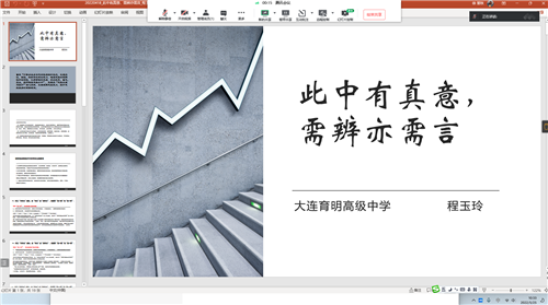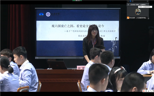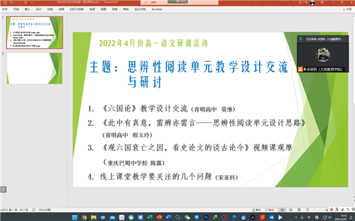 受線上教學的限制,本次活動動包括四個部分的內(nèi)容。首先由大連市育明高中莫維說課,說課的內(nèi)容是《六國論》教學設計。莫老師的說課從課標中有著思辨性閱讀與寫作學習任務群的要求入手,結(jié)合語文核心素養(yǎng),對自己這一課的教學設計進行了講解與說明。然后由大連市育明高中高一備課組長程玉玲老師,主講了“此中有真意,需辨亦需言”的講座,講座中,程老師首先交流了備課組在備課時的具體做法,從研究教材教參中的要求著手,樹立“大單元”意識,從“單元”到“跨單元”,處理好“這一篇”和“這一類”,強調(diào)了要重視“這一篇”,因為它是聯(lián)系擴展的根基;也強調(diào)了立足“這一篇”,旨在“這一類”,因為這是學生的能力培養(yǎng)與體現(xiàn)。第二方面介紹了這個單元中讀寫融合,勾連閱讀與表達的具體做法。最后,從文言文教學入手,確定了四個方面的學習內(nèi)容:積累、內(nèi)容、鑒賞與拓展并進,切實開展好思辨性閱讀與寫作單元的教學。第三個部分播放了一節(jié)中國教研網(wǎng)上曾經(jīng)直播過的一節(jié)觀摩課,《觀六國衰亡之因,看史論文的談古論今》。第四個部分,研訓老師分析最近一個月線上教學中出現(xiàn)的問題,并提出相應的改進策略。