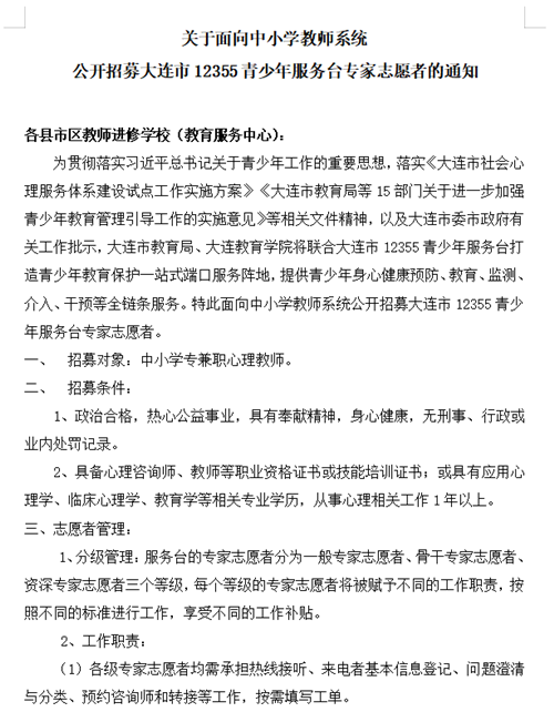 為貫徹落實《大連市社會心理服務(wù)體系建設(shè)試點工作實施方案》《大連市教育局等15部門關(guān)于進一步加強青少年教育管理引導(dǎo)工作的實施意見》等相關(guān)文件精神,大連市教育局、大連教育學(xué)院將聯(lián)合大連市12355青少年服務(wù)臺為青少年提供身心健康預(yù)防、教育、監(jiān)測、介入、干預(yù)等全鏈條服務(wù)。6月21日下午,德育心理研訓(xùn)中心面向各縣市區(qū)負責(zé)心理健康教育工作的教研員,線上召開了“12355青少年服務(wù)臺專家志愿者”招募工作說明會。