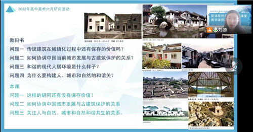 研訓活動首先總結了2022年第二學期3-6月學科主要活動實施與開展情況。隨后針對“新課程理念下的美術課堂教學課例觀摩——指向核心素養(yǎng)的高中美術深度學習”主題,分析來自北京市八一中學趙森森老師的展示課《人居與環(huán)境——詩意的棲居》。從教材解讀與內(nèi)容選取,基于新課標的教學設計思路梳理,值得借鑒與學習的教學實施細節(jié)等方面,帶領參會教師再次觀摩課程,尤其結合剛剛結束的高中美術市優(yōu)質(zhì)課評比參評課程的優(yōu)點與不足,帶著問題邊觀摩邊分析,加深理解。最后,劉源老師簡要介紹2022年高中美術評優(yōu)課活動開展情況,公布評比成績,本次評優(yōu)活動16人參與,根據(jù)比例秉持公開、公平、公正原則評選出一等獎5名,并會在接下來的研訓活動中陸續(xù)將優(yōu)秀課程與大家分享學習。