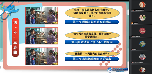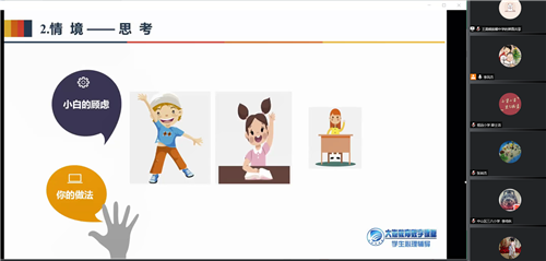 在部門李玉榮主任指導(dǎo)下,本次教研活動依托騰訊會議,以觀摩研討不同學(xué)段“拒絕”主題心理微課為主題,設(shè)計四個環(huán)節(jié),分別是熱身、觀摩心理微課、教學(xué)反思和研討以及專家點評。