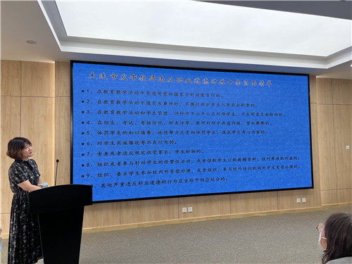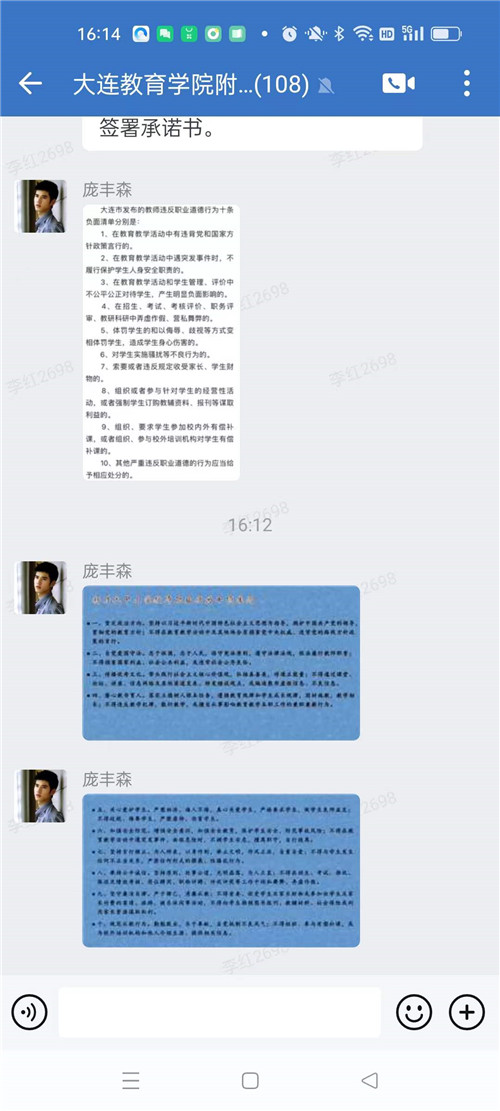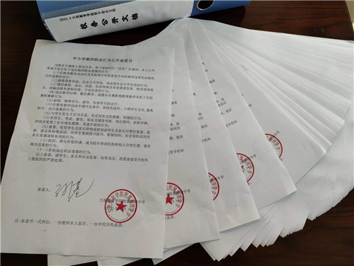 林杉書記傳達(dá)了大連市教育局印發(fā)《關(guān)于開展中小學(xué)教師有償補(bǔ)課和違規(guī)收受禮品禮金等問題專項(xiàng)整治工作實(shí)施方案》的通知精神要求,再次領(lǐng)學(xué)了《新時代中小學(xué)教師職業(yè)行為十項(xiàng)準(zhǔn)則》和《大連市中小學(xué)、幼兒園教師違反職業(yè)道德行為負(fù)面清單》,在觀看了4個師德警示教育案例之后,學(xué)校與全體教工簽訂了《中小學(xué)教師職業(yè)行為公開承諾書》。
