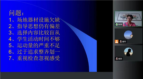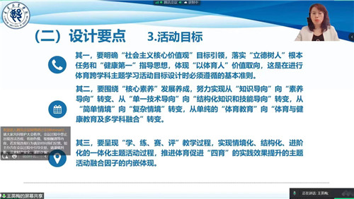 23日,北京師范大學毛振明教授分享主題《新課標提示核心素養(yǎng)項目背景下體育與健康課程改革的三大任務》,強調落實體育教學中的“立德樹人”,實現(xiàn)“大單元教學”與“走班制教學”模式,從宏觀到微觀、從理念到方法對骨干教師進行了精神和思維層面的洗禮;大連教育學院周圣老師以《新課程標準背景下學科教學設計優(yōu)化的實踐與思考》為主題,對新課程標準下的教學設計進行深入分析,闡釋了新時代學校體育的價值,交流了“一體化”“結構化”等新課標關鍵詞的理解,以案例切片分享,引導教師對教學設計優(yōu)化的探索。