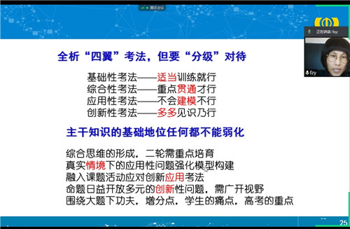 三位老師以自己命制的試題為樣本,幫助老師們正確理解新高考評(píng)價(jià)體系的要求與規(guī)則,傅老師針對(duì)怎么考的“四行策略”、張老師針對(duì)信息提取強(qiáng)化策略、竇老師的理解科研故事-建立思考模型策略等,幫助老師們理解為什么考、考什么與怎么考,把握復(fù)習(xí)內(nèi)容的重點(diǎn)、難點(diǎn)與熱點(diǎn)。
