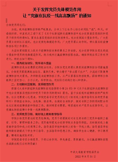 8月30日,市委組織部、市直機(jī)關(guān)工委下發(fā)了《關(guān)于在新冠肺炎疫情防控中充分發(fā)揮基層黨組織和黨員干部作用的通知》,要求各基層黨組織夯實防控責(zé)任,充分發(fā)揮戰(zhàn)斗堡壘作用;廣大黨員要主動到社區(qū)報到,充分發(fā)揮先鋒模范作用;廣大黨員要以身作則,帶頭落實好疫情防控各項工作要求。學(xué)院黨委立即行動,下發(fā)了《關(guān)于發(fā)揮黨員先鋒模范作用讓“黨旗在抗疫一線高高飄揚(yáng)”的通知》,號召學(xué)院全體黨員、干部以身作則、率先垂范、勇?lián)厝危瑸榇蜈A疫情防控阻擊戰(zhàn)做出學(xué)院人應(yīng)有的貢獻(xiàn)。