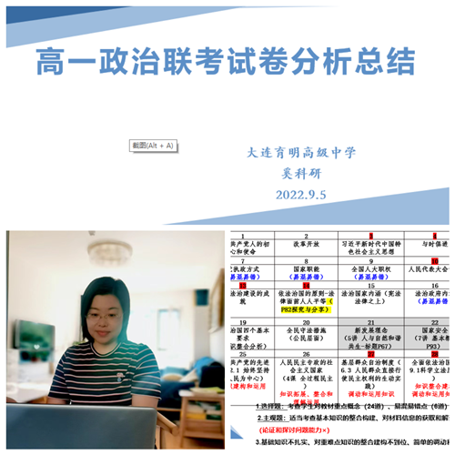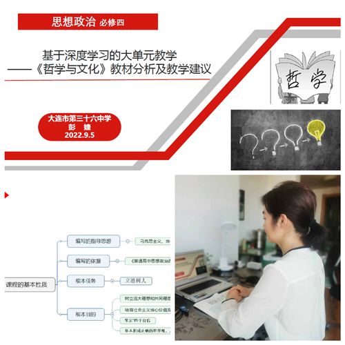 活動主要有兩個內(nèi)容。首先是大連市育明高級中學(xué)思政教師奚科研對高一期末考試進行總結(jié),奚老師從命題宗旨、試卷結(jié)構(gòu)、試題分布、考查重點等方面對試卷進行了深度剖析,詳細講解了得分率偏低的重點題目,透過卷面成績分析了教學(xué)中存在的問題和不足,并結(jié)合自己教學(xué)實踐提供了很有借鑒價值的教學(xué)建議。其次是大連市第三十六中學(xué)黨支部副書記彭婕老師做了“基于深度學(xué)習(xí)的大單元教學(xué)——《哲學(xué)與文化》教材分析與教學(xué)建議”專題講座,彭老師結(jié)合《哲學(xué)與文化》的教材編寫、知識邏輯以及名師工作室的大單元教學(xué)設(shè)計成果,就如何確定適切的大單元教學(xué)主題、如何保證大單元教學(xué)內(nèi)容的科學(xué)邏輯建構(gòu)、如何設(shè)定層次遞進的學(xué)習(xí)任務(wù)等大單元實施過程中的關(guān)鍵問題進行了鞭辟入里的分析和說明,并從新高考的角度列舉基于深度學(xué)習(xí)的新教材實施、新課程落實的大單元教學(xué)實例。