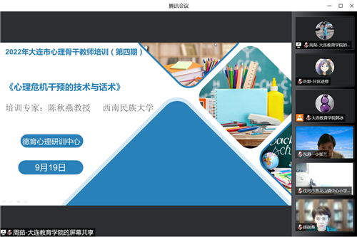 心理健康教育是一項專業(yè)性很強的工作,需要從業(yè)教師具有較系統(tǒng)的心理學(xué)專業(yè)知識和技能,教師的專業(yè)化程度將決定著學(xué)校心理健康教育的規(guī)范性和科學(xué)性。因此需要有針對性的專門培養(yǎng),提高專業(yè)能力,切實發(fā)揮骨干教師人選在區(qū)域內(nèi)的帶領(lǐng)作用。按照《大連市“十四五”中小學(xué)(幼兒園)教師培訓(xùn)規(guī)劃》《大連市“十四五”中小學(xué)(幼兒園)教師培訓(xùn)方案》要求,德育心理研訓(xùn)中心于9月19日開展了大連市心理骨干教師的第四期培訓(xùn),本次參訓(xùn)對象包括大連市心理骨干教師和中小學(xué)心理危機干預(yù)骨干教師共55人次。