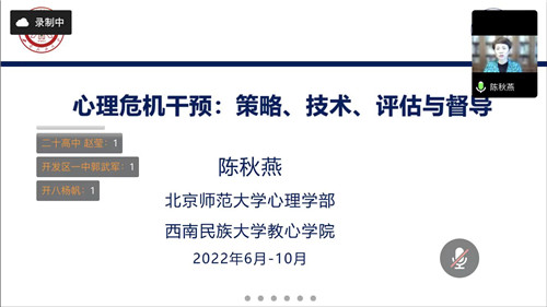 本此培訓(xùn)采用騰訊會議的形式,邀請了西南民族大學(xué)陳秋燕教授,圍繞心理危機干預(yù)策略、技術(shù)、評估與督導(dǎo)的內(nèi)容進(jìn)行系統(tǒng)講解,并且于線上現(xiàn)場與參訓(xùn)教師對一例校園危機干預(yù)案例進(jìn)行分角色體驗咨詢,參訓(xùn)教師分別從來訪者、觀察員及咨詢師的角度進(jìn)行分享。