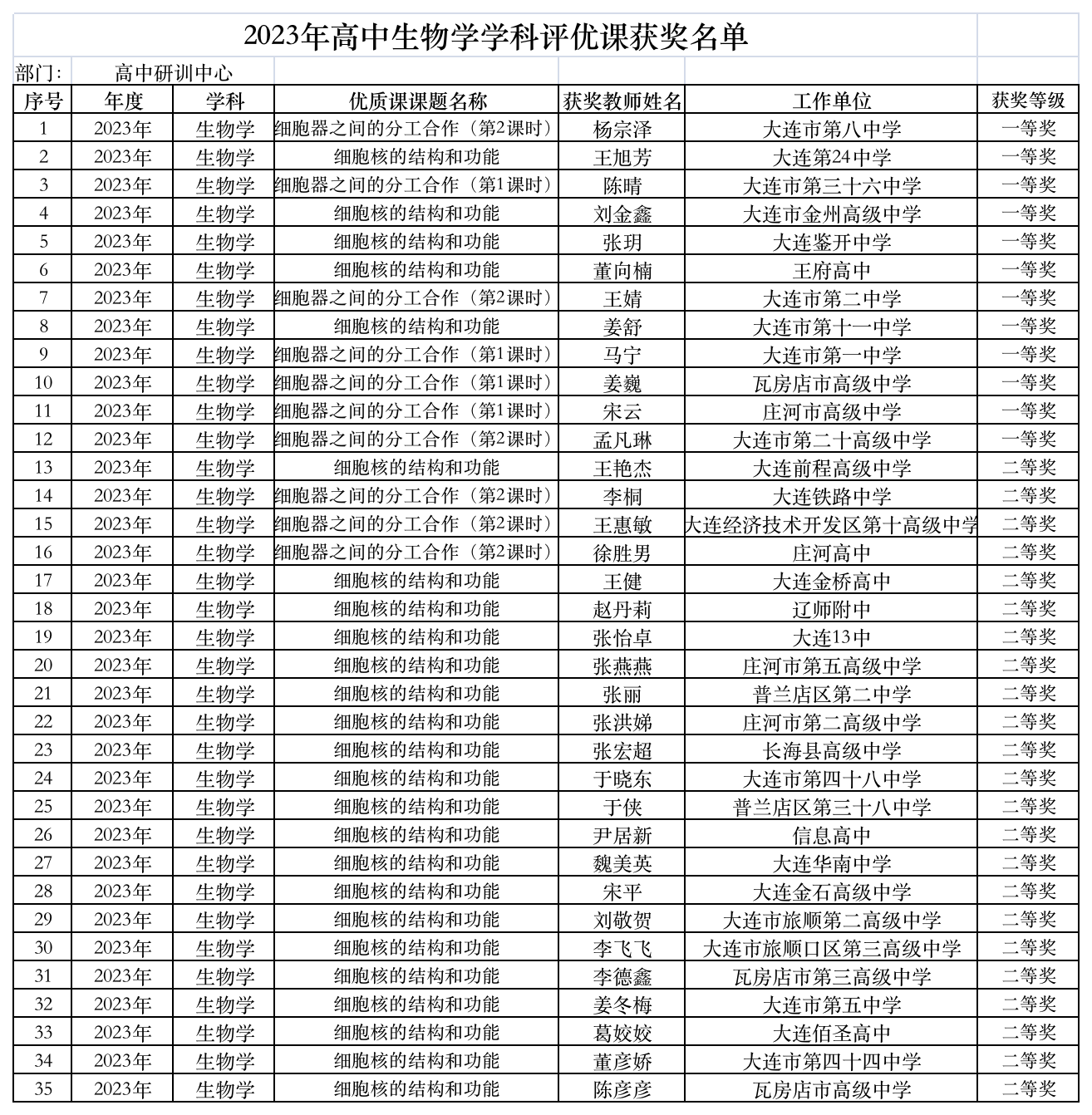 2023年大連市高中生物學(xué)學(xué)科優(yōu)質(zhì)課評(píng)選工作接近尾聲。根據(jù)公平、公正、公開(kāi)的原則,評(píng)委會(huì)嚴(yán)格按照遼寧教育學(xué)院《關(guān)于開(kāi)展主題為"堅(jiān)持立德樹(shù)人、落實(shí)核心素養(yǎng)"的遼寧省普通高中優(yōu)質(zhì)課、優(yōu)秀教學(xué)成果評(píng)比工作通知》的要求,進(jìn)行了嚴(yán)謹(jǐn)?shù)脑u(píng)選。現(xiàn)將評(píng)選結(jié)果公布如下: