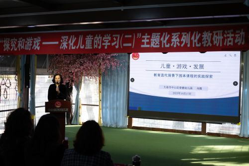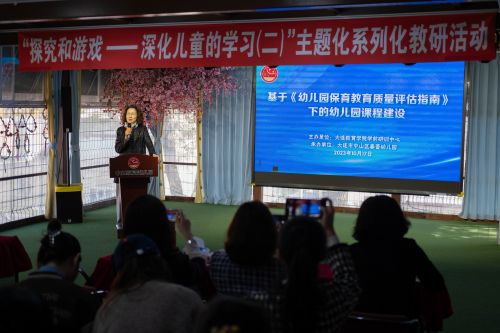 2023年10月17日上午,“以游戲?yàn)楹诵牡挠變簣@課程實(shí)施”主題化系列化教研活動(dòng),在大連市中山區(qū)春蕾幼兒園組織開(kāi)展,此次教研活動(dòng)的主題是《探究和游戲——深化兒童的學(xué)習(xí)》”系列研討之二,圍繞“課程兒童共生長(zhǎng)”主題展開(kāi)。活動(dòng)由學(xué)前研訓(xùn)中心李曉玫主持,專(zhuān)題組園長(zhǎng)、教師30余人參與活動(dòng)。