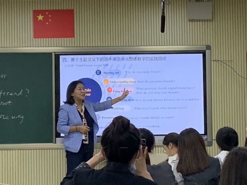 隨后,大連市高中英語(yǔ)教研員孫越老師全英文做了現(xiàn)場(chǎng)講座和評(píng)課。孫老師首先解釋了開(kāi)展“雙新背景下指向深度學(xué)習(xí)的單元教學(xué)范式的建構(gòu)”系列化主題教研的原因、意義和實(shí)施步驟,充分激發(fā)了教師們參與教學(xué)研討的積極性。然后孫老師結(jié)合UMU問(wèn)卷結(jié)果分析本節(jié)課的授課的難點(diǎn)、重點(diǎn)和連冰老師處理這節(jié)課的精妙之處。