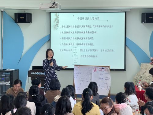 活動(dòng)中,首先由中山區(qū)春海幼兒園杜晶園長進(jìn)行幼兒園經(jīng)驗(yàn)分享,杜晶園長主要從幼兒園戶外環(huán)境創(chuàng)設(shè)、場地規(guī)劃、材料投放、戶外活動(dòng)組織實(shí)施、教師專業(yè)發(fā)展和多元化的評(píng)估評(píng)價(jià)等內(nèi)容詳細(xì)介紹了幼兒園戶外運(yùn)動(dòng)游戲的相關(guān)研究與實(shí)踐經(jīng)驗(yàn);接著全體教師觀摩了幼兒園的戶外自主運(yùn)動(dòng)游戲和操節(jié)活動(dòng);隨后全體參會(huì)老師分為6組就幼兒運(yùn)動(dòng)量的相關(guān)問題展開了研討;最后朱璟老師就如何保障幼兒戶外活動(dòng)的運(yùn)動(dòng)量開展了理論與實(shí)踐相結(jié)合的專題培訓(xùn),主要圍繞為什么要關(guān)注幼兒運(yùn)動(dòng)量、運(yùn)動(dòng)量的定義與教師觀察要點(diǎn)、如何提高幼兒戶外活動(dòng)運(yùn)動(dòng)量、本土化的實(shí)踐案例等內(nèi)容進(jìn)行了詳細(xì)的介紹,還提出了幼兒園下一步研究關(guān)注的重點(diǎn)和研究方向。