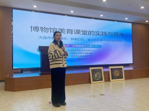 11月7日下午,大連市普通高中、旅順口區(qū)、普蘭店區(qū)美術(shù)學(xué)科研訓(xùn)活動(dòng)于普蘭店楊樹房大楊博物館開展,培訓(xùn)由大連教育學(xué)院藝體勞研訓(xùn)中心高中美術(shù)研訓(xùn)教師劉源主持,旅順口區(qū)美術(shù)研訓(xùn)教師周鵬、普蘭店區(qū)美術(shù)研訓(xùn)教師姜丹及近百名中小學(xué)美術(shù)教師參會(huì)。本次研訓(xùn)活動(dòng)圍繞“博物館美育課堂的實(shí)踐與思考”及“水彩畫創(chuàng)作實(shí)踐與作品賞析”主題開展。周鵬老師淺談美術(shù)教師專業(yè)成長(zhǎng)與學(xué)科教學(xué)能力提升的關(guān)聯(lián)性,姜丹老師介紹大楊集團(tuán)“一群人、一件事、一輩子”執(zhí)著與堅(jiān)守的從業(yè)精神及對(duì)中國(guó)傳統(tǒng)藝術(shù)文化的傳承與創(chuàng)新。