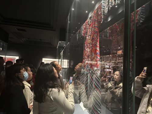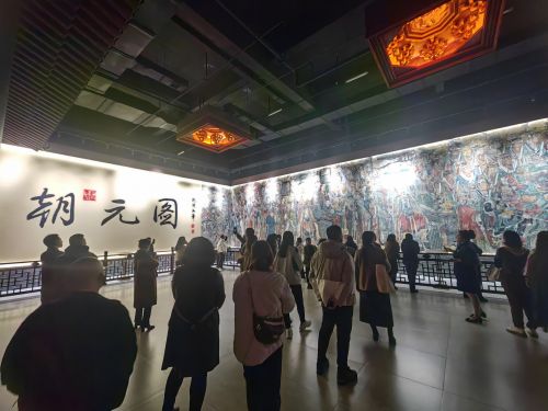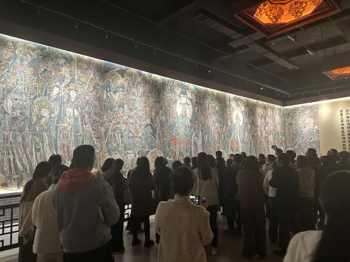 講座后,全體與會(huì)老師跟隨博物館講解人員參觀大楊博物館館藏民間藝術(shù)品與古代壁畫展。大楊博物館三樓為珍藏緙絲工藝歷代龍袍與刺繡珍品館,四樓為永樂宮壁畫館,通過高清掃描打印技術(shù)、瀝粉貼金工藝,按1∶1比例復(fù)制國(guó)寶永樂宮《朝元圖》壁畫,規(guī)模和形制與實(shí)物一般,場(chǎng)面開闊,氣勢(shì)恢宏。壁畫中近300名人物服飾冠帶華麗輝煌,用筆勁健而流暢,既含蓄又有力度,衣帶飛舞飄逸,有如滿墻風(fēng)動(dòng),充分展現(xiàn)了線條的生動(dòng)表現(xiàn)力。