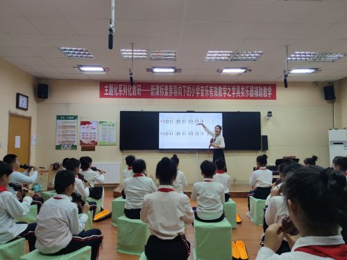 薛金老師結合三堂小學的全員樂器演奏展示和丁婧老師的現(xiàn)場課例,作了題為《新課標素養(yǎng)導向下課堂樂器教學的實踐與思考》專題講座,梳理了國家和省市美育政策文件以及課程標準中對于演奏教學的相關要求,同時結合學業(yè)要求和教學提示,闡述了新課標素養(yǎng)導向下課堂樂器教學的實踐路徑。