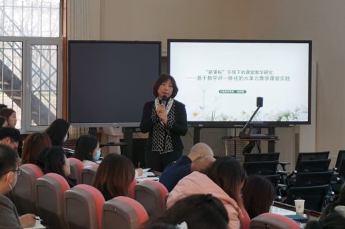第二部分,楊丹妮老師進行了以“大單元教學課例實踐研究”為主題的匯報。楊老師首先與在場教師一同分享觀課感受。楊老師對三位教師的個人素養(yǎng)和教學過程給予了肯定,并為大家講解本次展示課例的設計理念,解答關于單元教學形式的疑問,為大單元教學實踐下一步的課堂案例研發(fā)提出了新的教學建議。