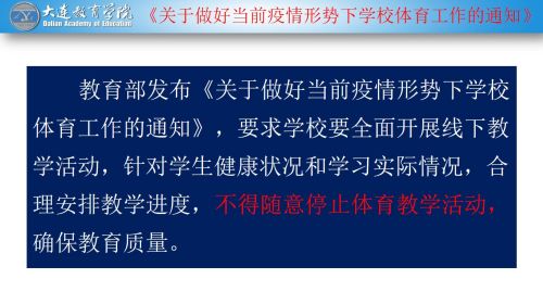 本次研訓(xùn)活動(dòng)是學(xué)院藝體勞研訓(xùn)中心成立后,高中體育與健康學(xué)科的第一次教研活動(dòng),此次會(huì)議以“新部門新氣象新作為”為主題,繼續(xù)做好學(xué)校體育工作,嚴(yán)格按照國家、省、市新冠肺炎疫情防控最新的部署和要求,突出新時(shí)代學(xué)校體育工作的重要使命和目標(biāo)是幫助學(xué)生在體育鍛煉中享受樂趣、增強(qiáng)體質(zhì)、健全人格、錘煉意志,積極有序開展學(xué)校體育工作,對(duì)樹立健康第一理念,增強(qiáng)學(xué)生體質(zhì)、提高免疫力、疏導(dǎo)心理焦慮,實(shí)現(xiàn)體育與健康教育深度融合,培養(yǎng)學(xué)生良好體育衛(wèi)生習(xí)慣,保障學(xué)生生命安全,嚴(yán)格落實(shí)教育部發(fā)布的《關(guān)于做好當(dāng)前疫情形勢(shì)下學(xué)校體育工作的通知》,要求學(xué)校要全面開展線下教學(xué)活動(dòng),針對(duì)學(xué)生健康狀況和學(xué)習(xí)實(shí)際情況,合理安排教學(xué)進(jìn)度,不得隨意停止體育教學(xué)活動(dòng),確保教育質(zhì)量。發(fā)揚(yáng)拼搶爭實(shí)作風(fēng),旗幟鮮明講政治,切實(shí)提高執(zhí)行力,努力煉就真本領(lǐng),不斷激發(fā)精氣神,以絕對(duì)忠誠的政治自覺、知重負(fù)重的優(yōu)良作風(fēng)、善作善成的過硬本領(lǐng)、攻堅(jiān)破難的斗爭精神,展現(xiàn)新氣象、新?lián)?dāng)、新作為,只爭朝夕、埋頭苦干,奮力實(shí)現(xiàn)大連市普通高中學(xué)校體育工作全面振興新突破三年行動(dòng)首戰(zhàn)告捷,齊心協(xié)力為我市教育全面振興做出體育人的新貢獻(xiàn)。