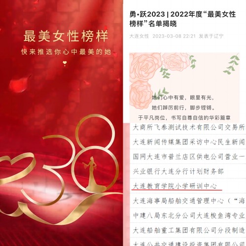 為大力宣傳大連市女性在“挺進(jìn)萬億GDP”的奮斗進(jìn)程中、在城市發(fā)展和社會(huì)進(jìn)步中的積極作用,于第113個(gè)“三八”婦女節(jié)之際,市婦聯(lián)在全市廣泛發(fā)起尋找“最美女性榜樣”活動(dòng)。經(jīng)過逐級(jí)推選和評(píng)審小組的綜合審定,大連教育學(xué)院小學(xué)研訓(xùn)中心榮獲2022年度“最美女性榜樣集體”稱號(hào)。