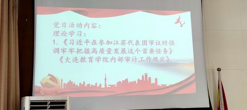 會(huì)上,林杉書(shū)記首先強(qiáng)調(diào)了本次黨日活動(dòng)的具體安排與要求,切實(shí)落實(shí)學(xué)院黨委的工作部署。王藝燁主任領(lǐng)學(xué)了《習(xí)近平在參加江蘇代表團(tuán)審議時(shí)強(qiáng)調(diào)牢牢把握高質(zhì)量發(fā)展這個(gè)首要任務(wù)》的講話精神;林杉書(shū)記領(lǐng)學(xué)了《大連教育學(xué)院內(nèi)部審計(jì)工作規(guī)定》(大教院黨發(fā)〔2022〕19號(hào))文件要求;觀看了《跨越十年山海大連-大連新時(shí)代十年成就專題黨課》短片。
