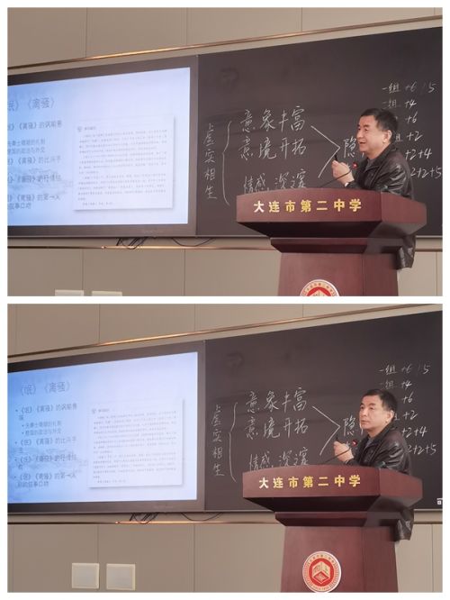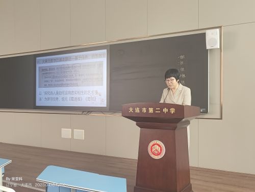活動總共分三個部分。大連市第二中學(xué)高二備課組長李國欣老師作了題為“播種詩情,詩意生活——小議比較閱讀教學(xué)”的專題講座,從三個方面介紹了高二備課組在選必下第一單元備課過程中以“比較閱讀”抓手,重新整合單元篇目,設(shè)置比較閱讀的專題課的具體作法。一是分析了大單元教學(xué)的基本路徑——基于任務(wù),統(tǒng)整教材,聚焦宏觀教材單元,基于任務(wù),聚合單篇側(cè)面,統(tǒng)整篇目,拼出更大閱讀視野,提升語文核心素養(yǎng);二是任務(wù)群教學(xué)的基本路徑——協(xié)作共生,由淺入深,李老師指出,任務(wù)是多任務(wù),既有自主又有協(xié)作,既有平面展開又有縱向深入,這就是所說的“群”的教學(xué);三是雙新背景下我校教學(xué)—基于學(xué)情,踏實求進(jìn),著重介紹了學(xué)校語文組將單篇教學(xué)和群文比較閱讀相結(jié)合的設(shè)想與作法。