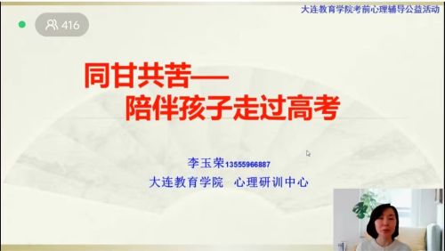 為了更好的指導(dǎo)家長在高考最后沖刺階段科學(xué)助考,幫助孩子調(diào)整應(yīng)考心態(tài),激發(fā)孩子學(xué)習(xí)主動性,4月15日下午,大連教育學(xué)院考前心理輔導(dǎo)專家團(tuán)隊李玉榮教授線上直播講座題為《同甘共苦陪伴孩子走過高考》,我市高中家長齊聚線上,共享精彩盛宴。