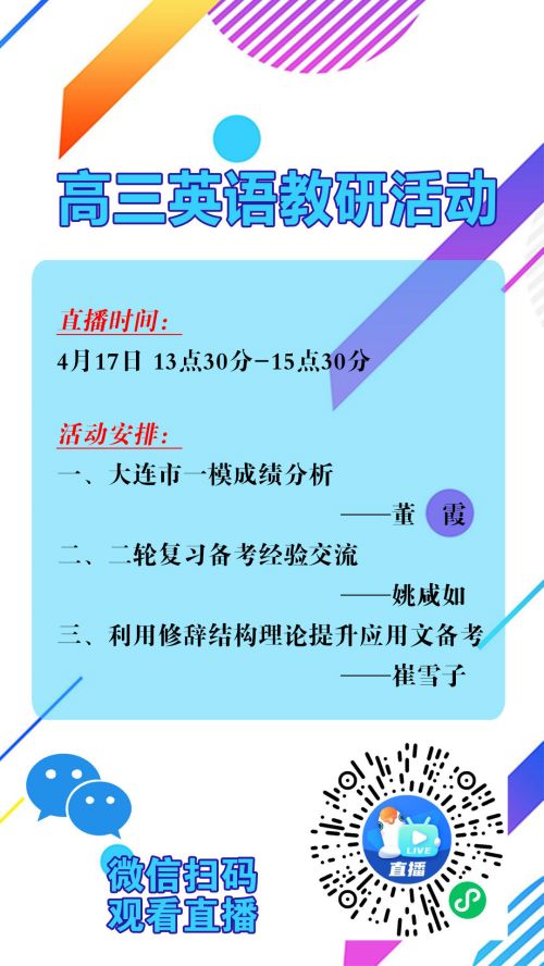 4月17日,大連市高中英語(yǔ)學(xué)科高三年級(jí)在大連教育學(xué)院附中301室舉行四月份研訓(xùn)活動(dòng)。北三市和長(zhǎng)海等地區(qū)的老師通過(guò)小鵝通進(jìn)行實(shí)時(shí)線上觀看。本次活動(dòng)的主題是大連市一模成績(jī)分析和三輪備考策略分享,活動(dòng)內(nèi)容共分成三個(gè)部分: