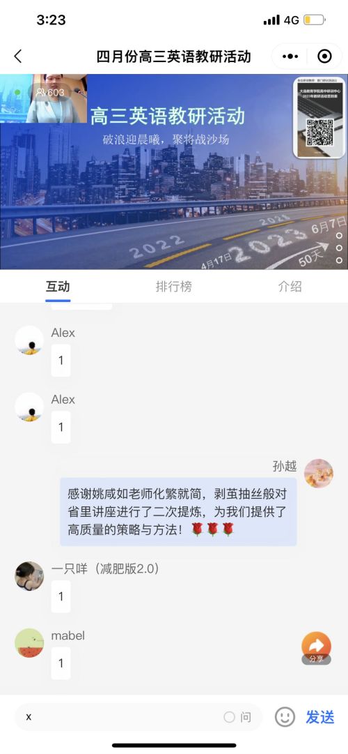本次教研活動(dòng)是高三年級(jí)首次線上線下同時(shí)進(jìn)行,這種形式充分發(fā)揮了線上線下教研的優(yōu)勢(shì),因?yàn)榛顒?dòng)內(nèi)容充實(shí),直擊老師們關(guān)注的教學(xué)熱點(diǎn)和難點(diǎn),得到老師們的普遍歡迎和肯定。在線觀摩人數(shù)不斷上漲,總計(jì)共有620位老師在線觀看,遠(yuǎn)超高三所有英語(yǔ)老師的數(shù)量。