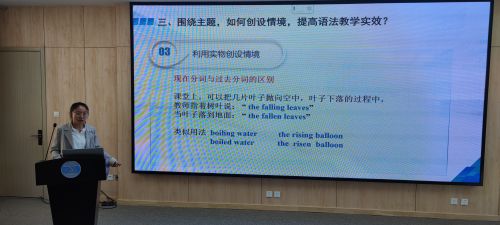 當(dāng)天上午,恰逢英語組進(jìn)行4月份的英語教研活動(dòng)。高三英語備課組組長姚咸如老師進(jìn)行了《高三一模英語成績分析》。姚老師分析了本校英語一模考試的總體情況并且講解了一模之后的英語教學(xué)策略;高二備課組組長遲金雙老師分享了《圍繞主題創(chuàng)設(shè)情景,提升語法教學(xué)實(shí)效》的教學(xué)建議。遲老師的教學(xué)建議分為四個(gè)部分:新高考下英語語法的教學(xué)方向探索;主題語境引領(lǐng)下的語法教學(xué)理念?PACE模式;圍繞主題,如何創(chuàng)設(shè)語境,提高語法教學(xué)實(shí)效;學(xué)校語法教學(xué)實(shí)踐。