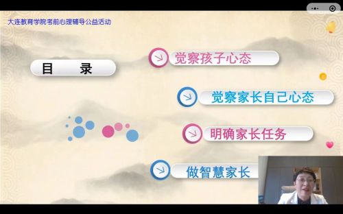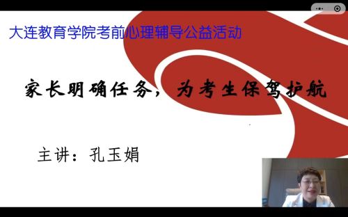為了緩解一模考試之后初中家長的心理壓力和焦慮情緒,幫助他們以平和的心態(tài)為考生加油助力。5月13日,大連教育學院考前心理輔導公益活動為初中家長開展線上直播專場講座,由考前心理輔導專家團隊孔玉娟老師主講,題為《家長明確任務為考生保駕護航》。