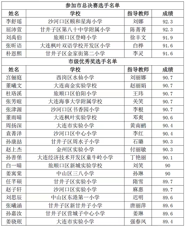 備注:1.小學(xué)組入圍市總決賽的選手將參加大連市"楓葉杯"英語(yǔ)演講比賽總決賽,具體事宜由大連市人民政府外事辦公室(下簡(jiǎn)稱(chēng)市外辦)組織實(shí)施。請(qǐng)等待市外辦電話(huà)或短信通知。