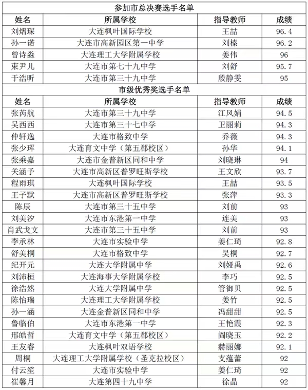 備注:1.初中組入圍市總決賽的選手將參加大連市"楓葉杯"英語演講比賽總決賽,具體事宜由大連市人民政府外事辦公室(下簡(jiǎn)稱市外辦)組織實(shí)施。請(qǐng)等待市外辦電話或短信通知。