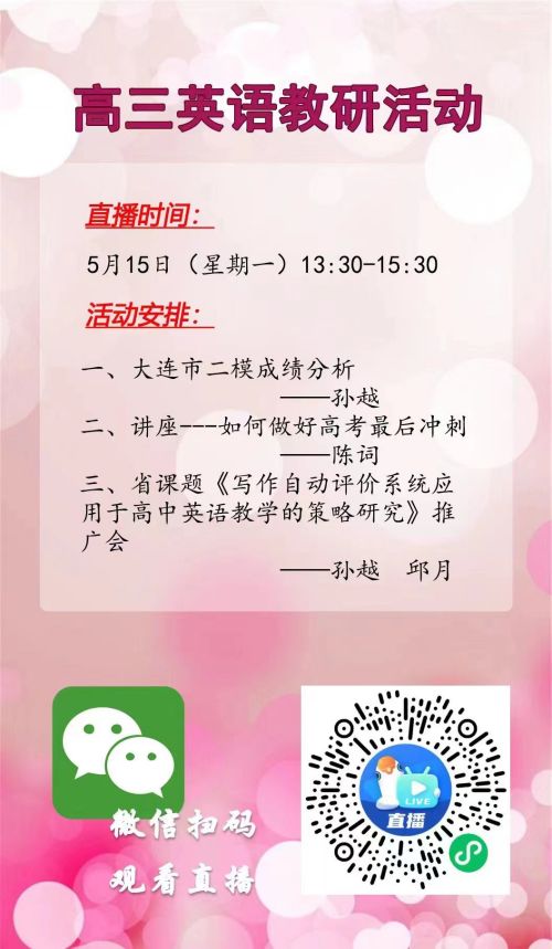 5月15日,大連市高中英語學(xué)科高三年級在大連鐵路中學(xué)順利舉行了五月份研訓(xùn)活動。有60多位老師進(jìn)行線下觀摩,650多名北三市和長海等地區(qū)的老師通過小鵝通進(jìn)行實(shí)時(shí)線上觀看。