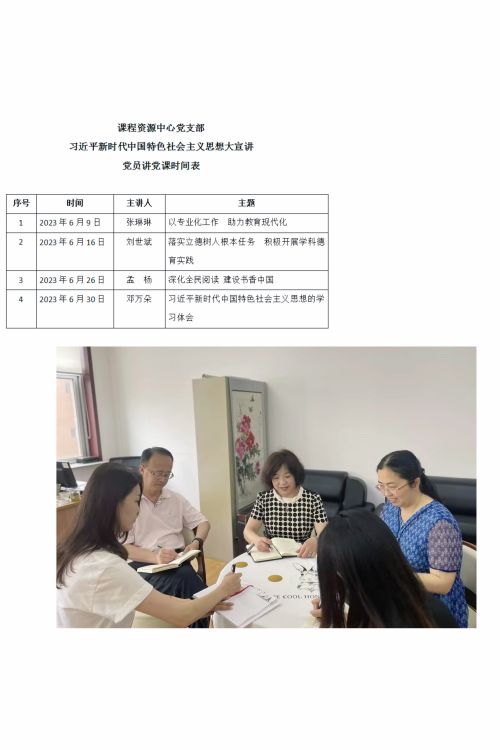 2023是不平凡的一年,黨的二十大勝利召開,為中華民族指明了前進(jìn)的方向。為了更好地慶祝建黨102周年,按照學(xué)院黨委工作部署,課程資源中心黨支部全體黨員在支部書記、部門主任張琳琳的帶動(dòng)下,圍繞習(xí)近平新時(shí)代中國(guó)特色社會(huì)主義思想開展了全員講黨課活動(dòng)。支部黨員鄧萬(wàn)朵老師圍繞習(xí)近平新時(shí)代中國(guó)特色社會(huì)主義思想的學(xué)習(xí)體會(huì)進(jìn)行了主題宣講;支部黨員劉世斌老師圍繞習(xí)近平總書記對(duì)于教師隊(duì)伍建設(shè)、師德師風(fēng)建設(shè)的指示精神,做了關(guān)于開展學(xué)科德育實(shí)踐的主題宣講;支部黨員孟楊老師圍繞深化全民閱讀、建設(shè)書香中國(guó)等內(nèi)容進(jìn)行了主題宣講。部門王婷婷老師列席會(huì)議,一同參與了學(xué)習(xí)交流。全體黨員和教師通過(guò)詳實(shí)的數(shù)據(jù)、生動(dòng)的案例,將黨課宣講和主題教育結(jié)合起來(lái),將理論學(xué)習(xí)與部門工作結(jié)合起來(lái),不斷拓展了理論學(xué)習(xí)的深度和廣度。