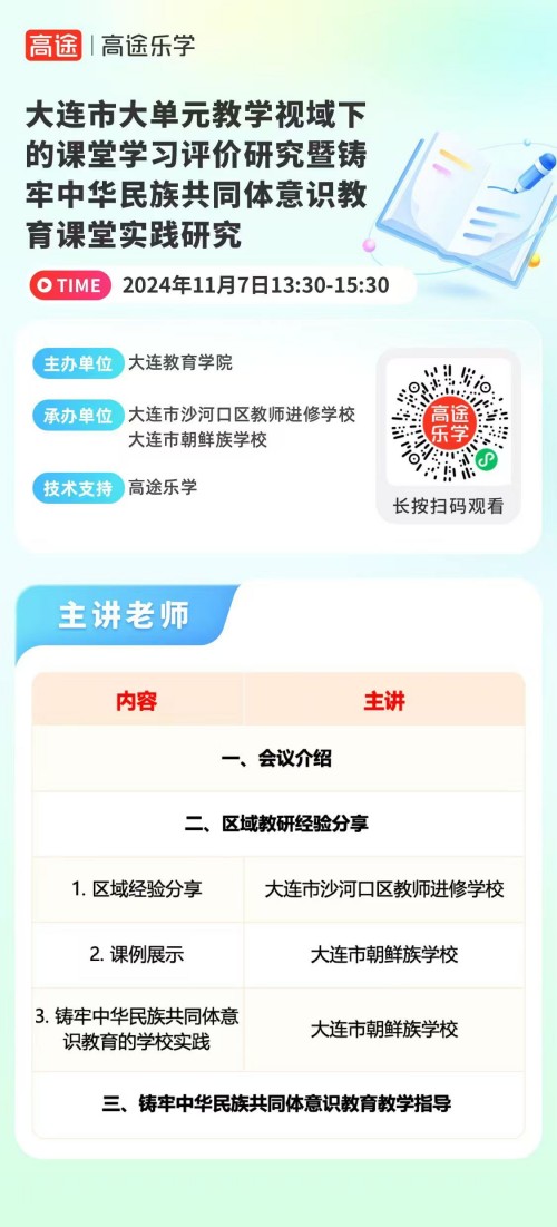 為全面貫徹落實(shí)鑄牢中華民族共同體意識(shí)教育融入小學(xué)思政課教學(xué)全過(guò)程,有效提高我市小學(xué)道德與法治教師的專(zhuān)業(yè)素養(yǎng)和教育教學(xué)能力,11月7日下午,大連市小學(xué)道德與法治年度系列主題教研活動(dòng)“大單元教學(xué)視域下的課堂學(xué)習(xí)評(píng)價(jià)暨鑄牢中華民族共同體意識(shí)教育課堂實(shí)踐研究”在大連市朝鮮族學(xué)校舉行。全市各小學(xué)相關(guān)領(lǐng)導(dǎo)、學(xué)科組長(zhǎng)、區(qū)(市)縣研訓(xùn)教師共600余人參加了現(xiàn)場(chǎng)及遠(yuǎn)程集體學(xué)習(xí)。
