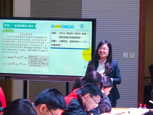 大家首先觀摩了精彩的展示課《從含氯消毒劑說起》。本節(jié)課依照學(xué)校“127”高效課堂教學(xué)范式,以消毒劑的發(fā)現(xiàn)和應(yīng)用歷史為脈絡(luò),在大單元視域下,將物質(zhì)結(jié)構(gòu)、氧化還原、離子反應(yīng)、化學(xué)平衡、化學(xué)反應(yīng)與電能等知識點進(jìn)行綜合復(fù)習(xí),有效地推動了學(xué)科能力的提升,確保了化學(xué)學(xué)科核心素養(yǎng)的穩(wěn)固落實。