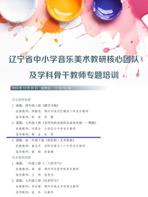 12月19日-20日,由遼寧教育學(xué)院主辦的“遼寧省中小學(xué)音樂美術(shù)教研核心團隊及學(xué)科骨干教師專題培訓(xùn)活動”在錦州市順利召開。大連市初中音樂學(xué)科優(yōu)秀課例在此次培訓(xùn)活動中作精彩展示,受到一致好評。