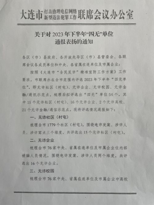 近日,大連市聯(lián)席辦在全市范圍內(nèi)評選2023年下半年“四無單位”,其中2所無詐高校,學院作為其中的一所獲此殊榮,全市通報表揚,這是對我院在防范電信網(wǎng)絡詐騙方面所做工作的充分肯定與鼓勵。