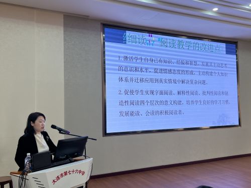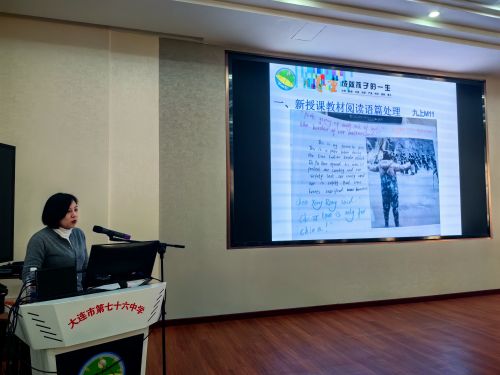 會議第一環(huán)節(jié),大連市第76中學英語教研組長兼初三英語組備課組長王艷老師分享了初三英語閱讀教學中的一篇多用、讀寫結(jié)合策略,王艷老師分別從課內(nèi)語篇閱讀、復(fù)習課教材語篇閱讀以及課外語篇閱讀三個層面介紹了在大單元整體教學設(shè)計理念下如何基于育人藍圖對多語篇進行關(guān)聯(lián),在遇到有價值的語篇如何從一篇多用的視角實現(xiàn)從育分向育人的教學思考與實踐。