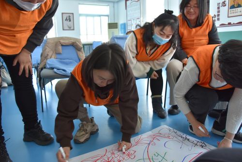 “抓手指”“大風(fēng)吹”“小風(fēng)吹”的熱身活動(dòng)瞬間讓場(chǎng)上的氛圍活躍起來(lái),身體的跑動(dòng)快速放松了心情。“說(shuō)字成組”讓老師們找到了自己的團(tuán)隊(duì),相親相愛(ài),迎接挑戰(zhàn)。每組隊(duì)員在組長(zhǎng)的帶領(lǐng)下取隊(duì)名、編口號(hào),在一張張大白紙上用絢麗多彩的畫(huà)筆譜寫(xiě)代表團(tuán)隊(duì)風(fēng)采的旗幟,用響亮的口號(hào)傳遞著團(tuán)隊(duì)的力量。“不倒森林”更加考驗(yàn)團(tuán)隊(duì)的配合,在失敗中總結(jié)經(jīng)驗(yàn),在挑戰(zhàn)中相互助力,在包容中凝聚力量,在信任中攜手并進(jìn)。