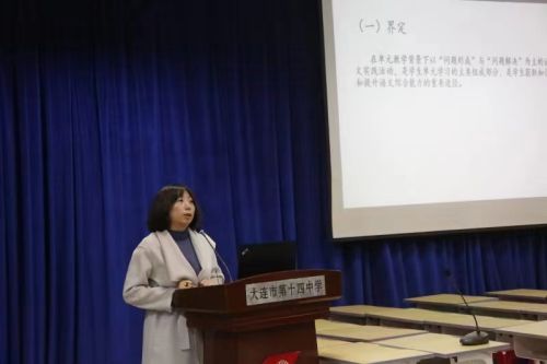 教是研之基礎(chǔ),研乃教之利器。市教研員楊丹妮老師圍繞“新課標(biāo)”引領(lǐng)下單元教學(xué)活動(dòng)設(shè)計(jì),從單元活動(dòng)的意義界定和原則兩方面,結(jié)合大連市第十四中學(xué)七年級(jí)語(yǔ)文學(xué)情調(diào)查表,條分理析地解讀大單元教學(xué)設(shè)計(jì)的具體落實(shí)。楊丹妮老師強(qiáng)調(diào)在大單元教學(xué)設(shè)計(jì)中以學(xué)情定目標(biāo),深究單元內(nèi)容,發(fā)展高階思維。用大單元引領(lǐng)教學(xué)理念、用大單元提升教師站位。最后,她勉勵(lì)與會(huì)教師,學(xué)習(xí)從來(lái)不是知識(shí)量的積累,而是思維通道的改變!