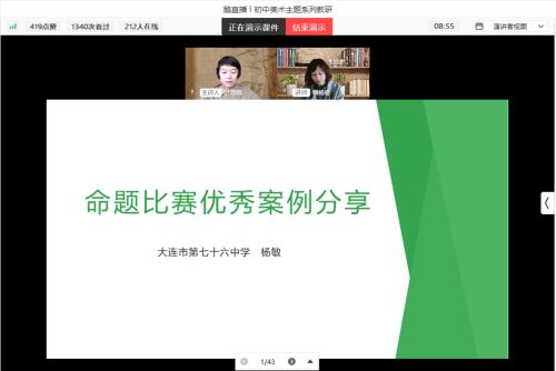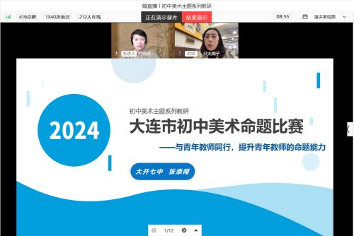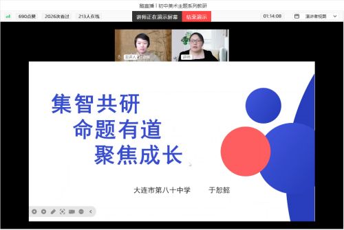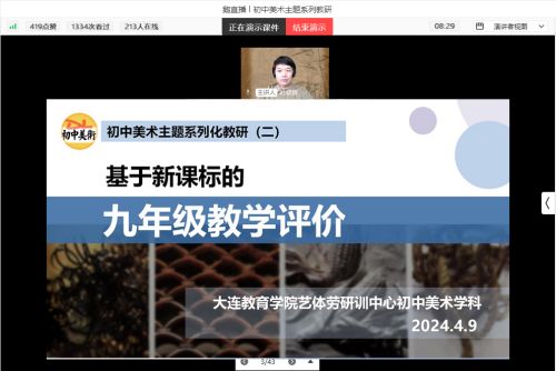 4月9日,大連市初中美術(shù)學(xué)科開(kāi)展了“基于新課標(biāo)的九年級(jí)教學(xué)評(píng)價(jià)”主題教研活動(dòng),也是本年度主題化系列化教研的第二次活動(dòng),通過(guò)鵝直播線上方式舉行。參加活動(dòng)的教師有各區(qū)市縣初中美術(shù)研訓(xùn)教師及一線美術(shù)教師共計(jì)212人。